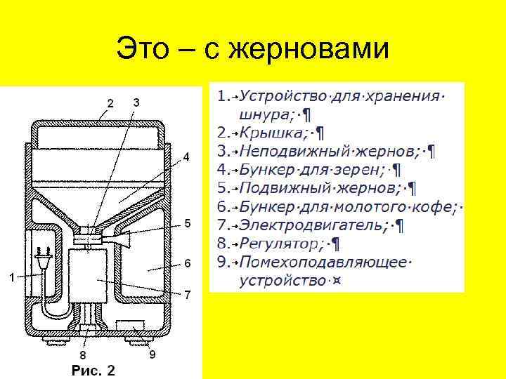 Электрокофемолки бывают ударного и жернового действия Это – ударная Зерна кофе размалывают вращающиеся ножи Степень помола Зависит от времени работы Помол неравномерный Но заметить это можно Лишь под микроскопом 1 Электродвигатель; 2 Чаша; 3 Нож; 4 Крышка; 5 Кнопка; 6 Толкатель