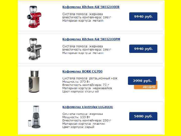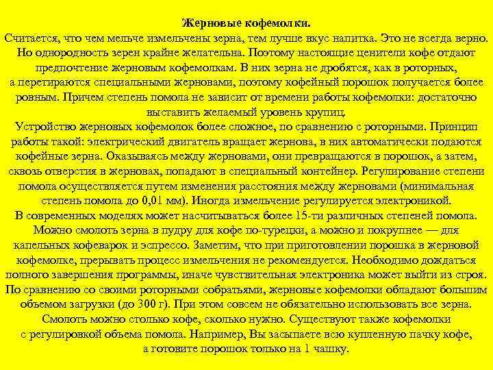 Жерновые кофемолки. Считается, что чем мельче измельчены зерна, тем лучше вкус напитка. Это не всегда верно. Но однородность зерен крайне желательна. Поэтому настоящие ценители кофе отдают предпочтение жерновым кофемолкам. В них зерна не дробятся, как в роторных, а перетираются специальными жерновами, поэтому кофейный порошок получается более ровным. Причем степень помола не зависит от времени работы кофемолки: достаточно выставить желаемый уровень крупиц. Устройство жерновых кофемолок более сложное, по сравнению с роторными. Принцип работы такой: электрический двигатель вращает жернова, в них автоматически подаются кофейные зерна. Оказываясь между жерновами, они превращаются в порошок, а затем, сквозь отверстия в жерновах, попадают в специальный контейнер. Регулирование степени помола осуществляется путем изменения расстояния между жерновами (минимальная степень помола до 0, 01 мм). Иногда измельчение регулируется электроникой. В современных моделях может насчитываться более 15 -ти различных степеней помола. Можно смолоть зерна в пудру для кофе по-турецки, а можно и покрупнее — для капельных кофеварок и эспрессо. Заметим, что приготовлении порошка в жерновой кофемолке, прерывать процесс измельчения не рекомендуется. Необходимо дождаться полного завершения программы, иначе чувствительная электроника может выйти из строя. По сравнению со своими роторными собратьями, жерновые кофемолки обладают большим объемом загрузки (до 300 г). При этом совсем не обязательно использовать все зерна. Смолоть можно столько кофе, сколько нужно. Существуют также кофемолки с регулировкой объема помола. Например, Вы засыпаете всю купленную пачку кофе, а готовите порошок только на 1 чашку.