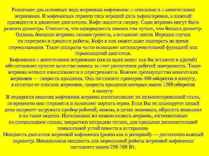 Различают два основных вида жерновых кофемолок: с плоскими и с коническими жерновами. В кофемолках первого типа верхний диск зафиксирован, а нижний приводится в движение двигателем. Кофе подается сверху. Сами жернова могут быть разного диаметра. Считается, что однородность помола тем лучше, чем больше диаметр. Однако, большие жернова сильно греются, а остывают долго. Нередки случаи их перегрева в процессе работы. Кофе в них может даже подгорать во время перемалывания. Такие аппараты часто оснащают антинагревательной функцией или термозащитой двигателя. Кофемолки с коническими жерновами (когда один конус как бы вставлен в другой) обеспечивают лучшее качество помола за счет увеличения рабочей поверхности. Такие жернова меньше изнашиваются и перегреваются. Важное преимущество конических жерновов — скорость вращения. Она составляет примерно 400 оборотов в минуту, в отличие от плоских жерновов, скорость вращения которых около 1200 оборотов в минуту. В недорогих моделях кофемолок жернова изготавливают из низколегированной стали, со временем они стираются и начинают портить зерно. Если Вы не планируете целый день напролет загружать прибор работой, можно, в целях экономии, обратить внимание и на такие модели. Идеальными же можно назвать жернова, изготовленные из специального сплава, покрытого нитридом титана, для придания дополнительной повышенной устойчивости к истиранию. Мощность двигателя жерновой кофемолки (равно как и роторной) — достаточно важный параметр. Номинальная мощность для нормальной работы жерновой кофемолки составляет около 250 -300 Вт.