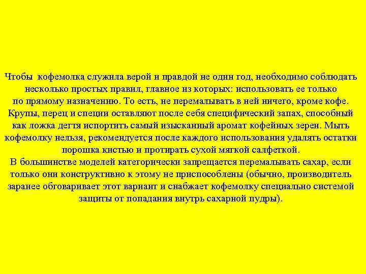 Чтобы кофемолка служила верой и правдой не один год, необходимо соблюдать несколько простых правил, главное из которых: использовать ее только по прямому назначению. То есть, не перемалывать в ней ничего, кроме кофе. Крупы, перец и специи оставляют после себя специфический запах, способный как ложка дегтя испортить самый изысканный аромат кофейных зерен. Мыть кофемолку нельзя, рекомендуется после каждого использования удалять остатки порошка кистью и протирать сухой мягкой салфеткой. В большинстве моделей категорически запрещается перемалывать сахар, если только они конструктивно к этому не приспособлены (обычно, производитель заранее обговаривает этот вариант и снабжает кофемолку специально системой защиты от попадания внутрь сахарной пудры).
