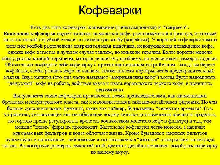 Кофеварки Есть два типа кофеварок: капельные (фильтрационные) и "эспрессо". Капельная кофеварка подает кипяток на молотый кофе, расположенный в фильтре, и готовый напиток тонкой струйкой стекает в стеклянную колбу (кофейник). У хорошей кофеварки такого типа под колбой расположена нагревательная пластина, недопускающая охлаждение кофе, однако кофе остается в лучшем случае теплым, но никак не горячим. Более дорогие модели оборудованы колбой-термосом, которая решает эту проблему, но увеличивает размеры изделия. Обязательно подберите себе кофеварку с противокапельным устройством - когда вы берете кофейник, чтобы разлить кофе по чашкам, автоматически перекрывается предохранительный клапан. Вкус напитка (его еще часто называют "американским кофе") всегда будет напоминать "дежурный" кофе на работе, добиться вкуса и цвета нормального черного кофе, в принципе, невозможно. Выпускаются такие кофеварки практически всеми производителями, как знаменитыми брендами международного класса, так и малоизвестными тайвано-китайскими фирмами. Но чем больше дополнительных функций, таких как таймер, будильник, "селектор аромата" (т. е. устройство, усиливающее или ослабляющее подачу кипятка для изменения крепости продукта, но гораздо проще регулировать крепость количеством молотого кофе в фильтре) и т. д. , тем меньше "левых" фирм их производит. Капельные кофеварки легко моются, а наличие одноразовых фильтров и вовсе облегчает жизнь. Кроме бумажных сменных фильтров существуют и постоянные - нейлоновые и так называемые "золотые" с покрытием из нитрида титана. Разнообразие размеров, емкостей колб, цветов и дизайна позволяет подобрать кофеварку по вашему вкусу.
