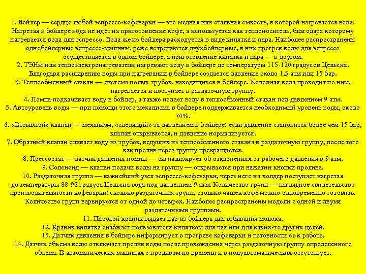1. Бойлер — сердце любой эспрессо-кофеварки — это медная или стальная емкость, в которой нагревается вода. Нагретая в бойлере вода не идет на приготовление кофе, а используется как теплоноситель, благодаря которому нагревается вода для эспрессо. Вода же из бойлера расходуется в виде кипятка и пара. Наиболее распространены однобойлерные эспрессо-машины, реже встречаются двухбойлерные, в них прогрев воды для эспрессо осуществляется в одном бойлере, а приготовление кипятка и пара — в другом. 2. ТЭНы или теплоэлектронагреватели нагревают воду в бойлере до температуры 115 -120 градусов Цельсия. Благодаря расширению воды при нагревании в бойлере создается давление около 1, 5 атм или 15 бар. 3. Теплообменный стакан — система полых трубок, находящихся в бойлере. Холодная вода проходит по ним, нагревается и поступает в раздаточную группу. 4. Помпа подкачивает воду в бойлер, а также подает воду в теплообменный стакан под давлением 9 атм. 5. Автоуровень воды — при помощи этого механизма в бойлере поддерживается необходимый уровень воды, около 70%. 6. «Взрывной» клапан — механизм, «следящий» за давлением в бойлере: если давление становится более чем 15 бар, клапан открывается, и давление нормализуется. 7. Обратный клапан сливает воду из трубок, ведущих из теплообменного стакана в раздаточную группу, после того как пролив через группу прекращается. 8. Прессостат — датчик давления помпы — сигнализирует об отклонениях от рабочего давления в 9 атм. 9. Соленоид — клапан подачи воды на группу — открывается при нажатии кнопки пролива. 10. Раздаточная группа — важнейший узел эспрессо-кофеварки, через него на холдер поступает нагретая до температуры 88 -92 градуса Цельсия вода под давлением 9 атм. Количество групп — наглядное свидетельство производительности кофеварки: сколько раздаточных групп, столько чашек кофе можно одновременно готовить. Количество групп варьируется от одной до четырех. Наиболее распространены модели с одной и двумя раздаточными группами. 11. Паровой краник выдает пар из бойлера для взбивания молока. 12. Краник кипятка снабжает пользователя кипятком для чая или для каких-то других целей. 13. Датчик давления в бойлере информирует о прогреве кофеварки и готовности ее к работе. 14. Датчик объема воды отключает пролив воды после прохождения через раздаточную группу определенного объема. В автоматических машинах с проливом по времени и в полуавтоматических отсутствует.