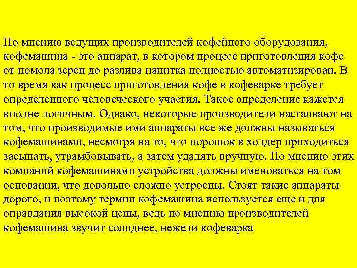 По мнению ведущих производителей кофейного оборудования, кофемашина - это аппарат, в котором процесс приготовления кофе от помола зерен до разлива напитка полностью автоматизирован. В то время как процесс приготовления кофе в кофеварке требует определенного человеческого участия. Такое определение кажется вполне логичным. Однако, некоторые производители настаивают на том, что производимые ими аппараты все же должны называться кофемашинами, несмотря на то, что порошок в холдер приходиться засыпать, утрамбовывать, а затем удалять вручную. По мнению этих компаний кофемашинами устройства должны именоваться на том основании, что довольно сложно устроены. Стоят такие аппараты дорого, и поэтому термин кофемашина используется еще и для оправдания высокой цены, ведь по мнению производителей кофемашина звучит солиднее, нежели кофеварка