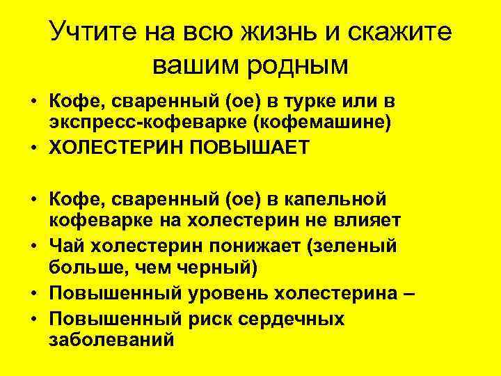 Учтите на всю жизнь и скажите вашим родным • Кофе, сваренный (ое) в турке или в экспресс-кофеварке (кофемашине) • ХОЛЕСТЕРИН ПОВЫШАЕТ • Кофе, сваренный (ое) в капельной кофеварке на холестерин не влияет • Чай холестерин понижает (зеленый больше, чем черный) • Повышенный уровень холестерина – • Повышенный риск сердечных заболеваний
