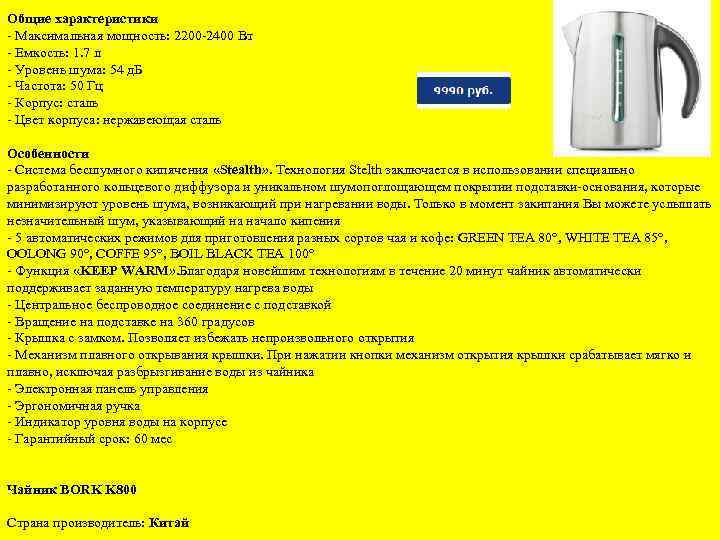 Общие характеристики - Максимальная мощность: 2200 -2400 Вт - Емкость: 1. 7 л - Уровень шума: 54 д. Б - Частота: 50 Гц - Корпус: сталь - Цвет корпуса: нержавеющая сталь Особенности - Система бесшумного кипячения «Stealth» . Технология Stelth заключается в использовании специально разработанного кольцевого диффузора и уникальном шумопоглощающем покрытии подставки-основания, которые минимизируют уровень шума, возникающий при нагревании воды. Только в момент закипания Вы можете услышать незначительный шум, указывающий на начало кипения - 5 автоматических режимов для приготовления разных сортов чая и кофе: GREEN TEA 80°, WHITE TEA 85°, OOLONG 90°, COFFE 95°, BOIL BLACK TEA 100° - Функция «KEEP WARM» . Благодаря новейшим технологиям в течение 20 минут чайник автоматически поддерживает заданную температуру нагрева воды - Центральное беспроводное соединение с подставкой - Вращение на подставке на 360 градусов - Крышка с замком. Позволяет избежать непроизвольного открытия - Механизм плавного открывания крышки. При нажатии кнопки механизм открытия крышки срабатывает мягко и плавно, исключая разбрызгивание воды из чайника - Электронная панель управления - Эргономичная ручка - Индикатор уровня воды на корпусе - Гарантийный срок: 60 мес Чайник BORK K 800 Страна производитель: Китай