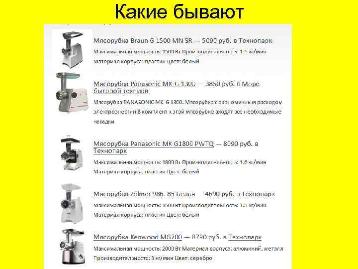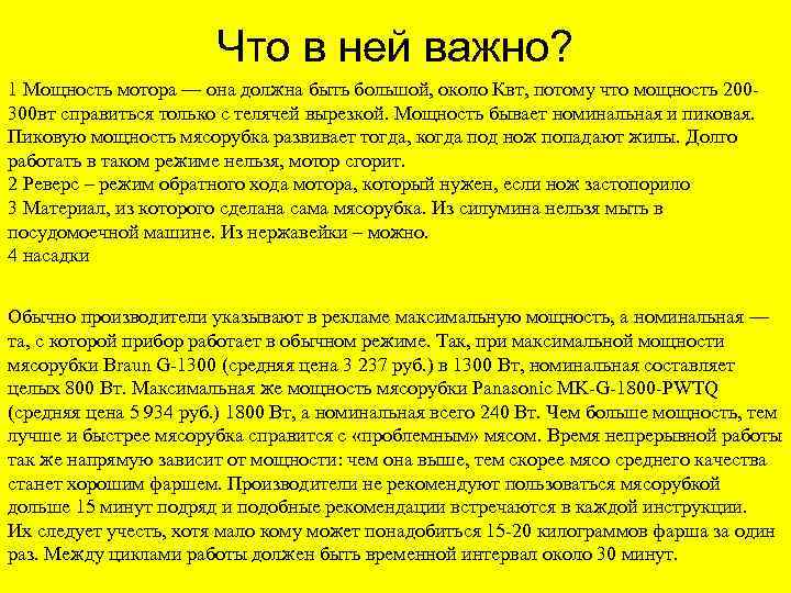 Что в ней важно? 1 Мощность мотора — она должна быть большой, около Квт, потому что мощность 200300 вт справиться только с телячей вырезкой. Мощность бывает номинальная и пиковая. Пиковую мощность мясорубка развивает тогда, когда под нож попадают жилы. Долго работать в таком режиме нельзя, мотор сгорит. 2 Реверс – режим обратного хода мотора, который нужен, если нож застопорило 3 Материал, из которого сделана сама мясорубка. Из силумина нельзя мыть в посудомоечной машине. Из нержавейки – можно. 4 насадки Обычно производители указывают в рекламе максимальную мощность, а номинальная — та, с которой прибор работает в обычном режиме. Так, при максимальной мощности мясорубки Braun G-1300 (средняя цена 3 237 руб. ) в 1300 Вт, номинальная составляет целых 800 Вт. Максимальная же мощность мясорубки Panasonic MK-G-1800 -PWTQ (средняя цена 5 934 руб. ) 1800 Вт, а номинальная всего 240 Вт. Чем больше мощность, тем лучше и быстрее мясорубка справится с «проблемным» мясом. Время непрерывной работы так же напрямую зависит от мощности: чем она выше, тем скорее мясо среднего качества станет хорошим фаршем. Производители не рекомендуют пользоваться мясорубкой дольше 15 минут подряд и подобные рекомендации встречаются в каждой инструкции. Их следует учесть, хотя мало кому может понадобиться 15 -20 килограммов фарша за один раз. Между циклами работы должен быть временной интервал около 30 минут.