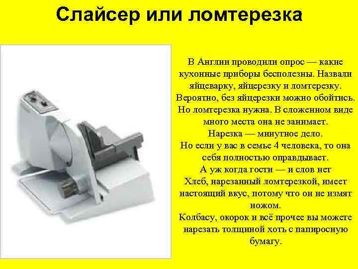 Слайсер или ломтерезка В Англии проводили опрос — какие кухонные приборы бесполезны. Назвали яйцеварку, яйцерезку и ломтерезку. Вероятно, без яйцерезки можно обойтись. Но ломтерезка нужна. В сложенном виде много места она не занимает. Нарезка — минутное дело. Но если у вас в семье 4 человека, то она себя полностью оправдывает. А уж когда гости — и слов нет Хлеб, нарезанный ломтерезкой, имеет настоящий вкус, потому что он не измят ножом. Колбасу, окорок и всё прочее вы можете нарезать толщиной хоть с папиросную бумагу.