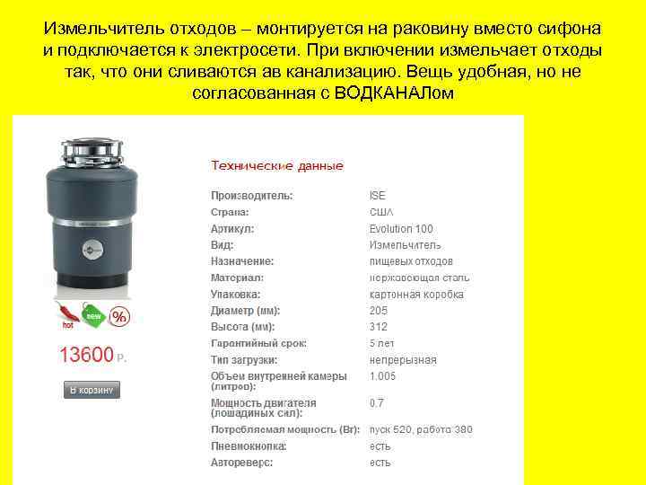 Измельчитель отходов – монтируется на раковину вместо сифона и подключается к электросети. При включении измельчает отходы так, что они сливаются ав канализацию. Вещь удобная, но не согласованная с ВОДКАНАЛом
