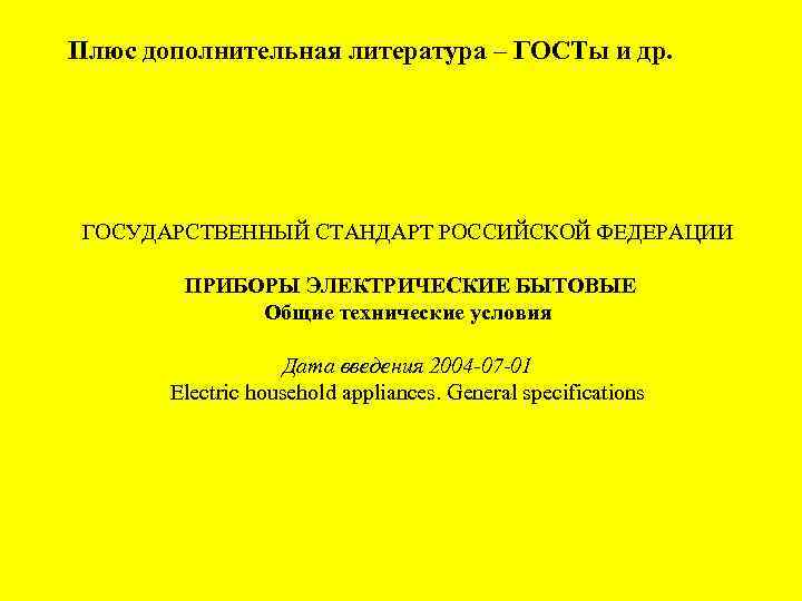 Плюс дополнительная литература – ГОСТы и др. ГОСУДАРСТВЕННЫЙ СТАНДАРТ РОССИЙСКОЙ ФЕДЕРАЦИИ ПРИБОРЫ ЭЛЕКТРИЧЕСКИЕ БЫТОВЫЕ Общие технические условия Дата введения 2004 -07 -01 Electric household appliances. General specifications