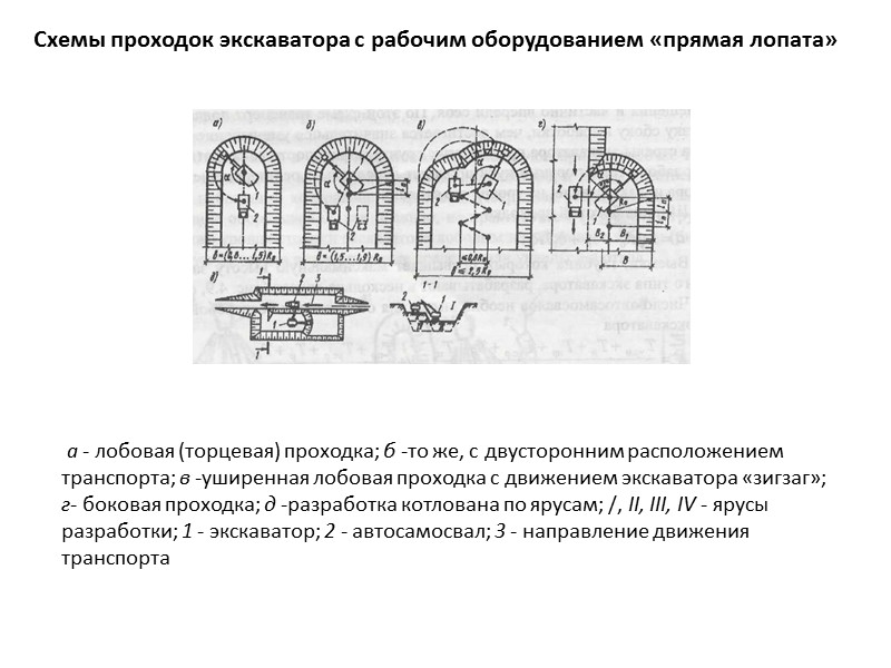 Схемы проходок экскаватора с рабочим оборудованием «прямая лопата» а - лобовая (торцевая) проходка; б -то же, с двусторонним расположением транспорта; в -уширенная лобовая проходка с движением экскаватора «зигзаг»; г- боковая проходка; д -разработка котлована по ярусам; /, II, III, IV - ярусы разработки; 1 - экскаватор; 2 - автосамосвал; 3 - направление движения транспорта