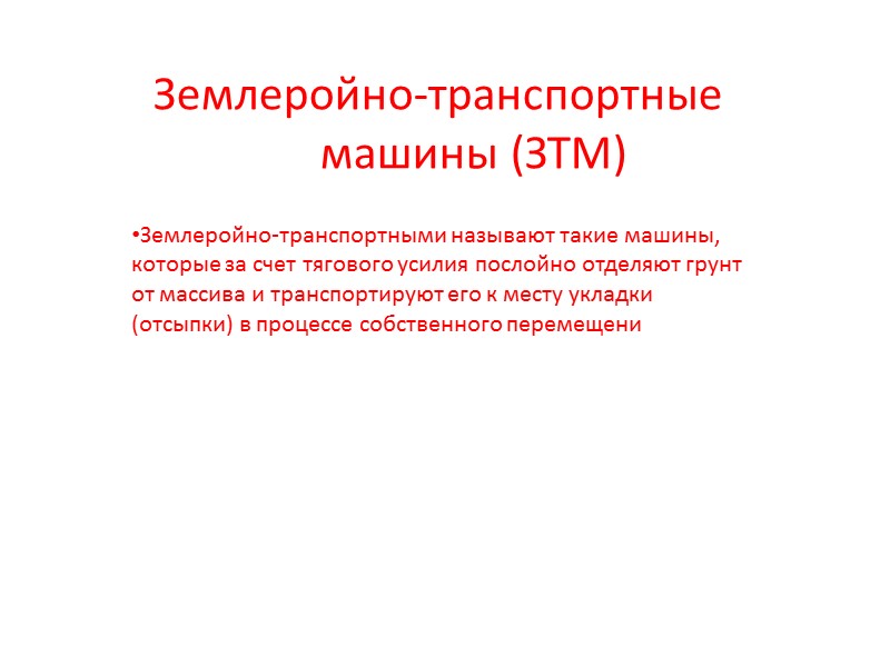 Землеройно-транспортные машины (ЗТМ) Землеройно-транспортными называют такие машины, которые за счет тягового усилия послойно отделяют грунт от массива и транспортируют его к месту укладки (отсыпки) в процессе собственного перемещени