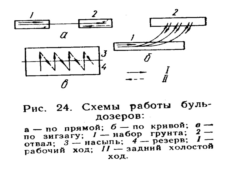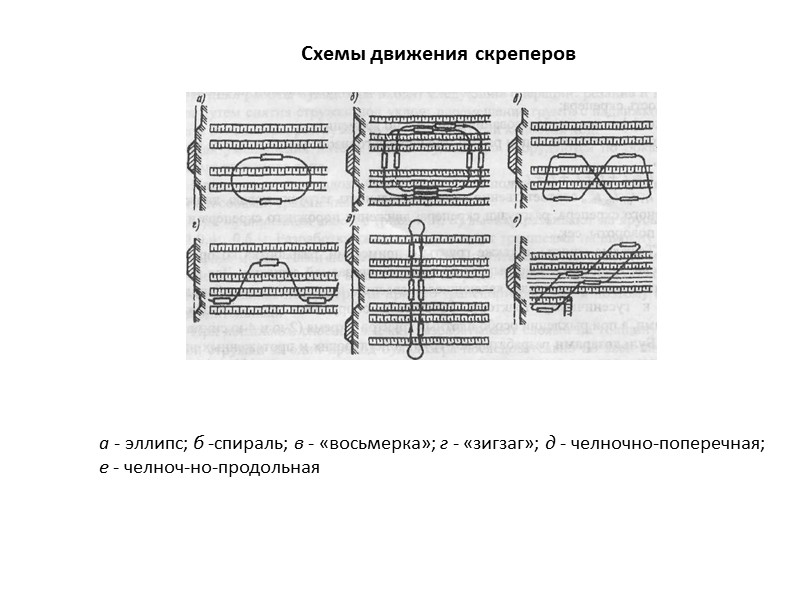 Схемы движения скреперов а - эллипс; б -спираль; в - «восьмерка»; г - «зигзаг»; д - челночно-поперечная; е - челноч-но-продольная