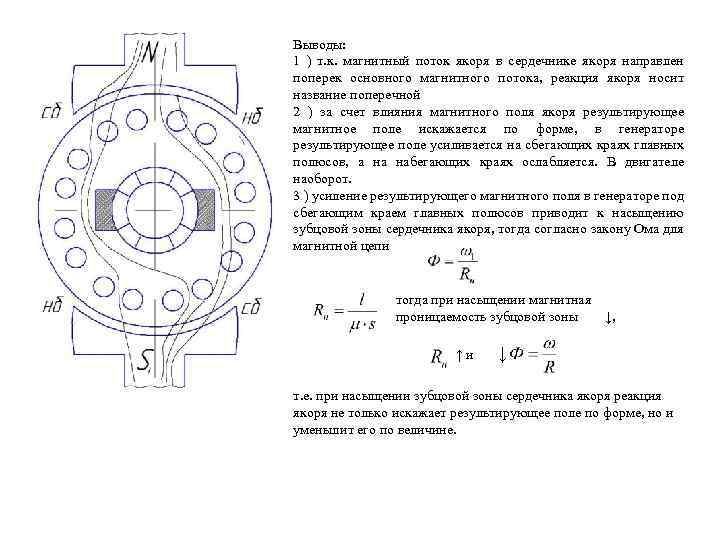 Выводы: 1 ) т. к. магнитный поток якоря в сердечнике якоря направлен поперек основного магнитного потока, реакция якоря носит название поперечной 2 ) за счет влияния магнитного поля якоря результирующее магнитное поле искажается по форме, в генераторе результирующее поле усиливается на сбегающих краях главных полюсов, а на набегающих краях ослабляется. В двигателе наоборот. 3 ) усиление результирующего магнитного поля в генераторе под сбегающим краем главных полюсов приводит к насыщению зубцовой зоны сердечника якоря, тогда согласно закону Ома для магнитной цепи тогда при насыщении магнитная проницаемость зубцовой зоны ↑и ↓, ↓ т. е. при насыщении зубцовой зоны сердечника якоря реакция якоря не только искажает результирующее поле по форме, но и уменьшит его по величине.