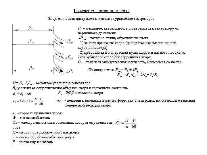 Генератор постоянного тока Энергетическая диаграмма и основное уравнение генератора. Р 1 – механическая мощность, подводиться к генератору от первичного двигателя. ΔРст – потери в стали, обуславливаются: 1) за счет вращения якоря (вращается перемагниченный сердечник якоря) 2) продольная и поперечная пульсация магнитного потока, за счет зубчатого строения сердечника якоря Р 2 – полезная электрическая мощность, снимаемая со щеток. Из диаграммы: Рэм= Р 2 +ΔРм Рэм= Еа ·Ia==U·Ia+ Ia 2 Ra U= Еа -Ia. Ra – основное уравнение генератора Ra учитывает сопротивление обмотки якоря и щеточного контакта. - ЭДС в обмотке якоря - величина, вводимая в расчет форм для учета размагничивающего влияния поперечной реакции якоря n - скорость вращения якоря. Ф – магнитный поток Се – электромагнитная постоянная, которая определяется , где N – число проводников обмотки якоря а – число пар ветвей обмотки якоря Р – число пар полюсов.