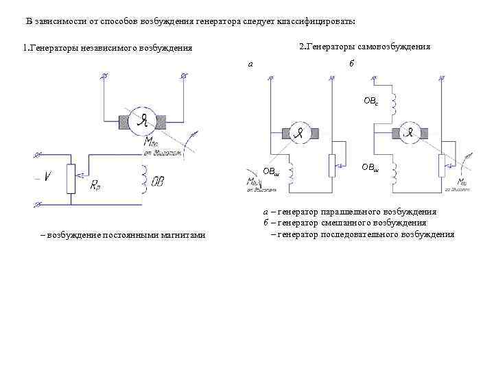 В зависимости от способов возбуждения генератора следует классифицировать: 2. Генераторы самовозбуждения 1. Генераторы независимого возбуждения a б ОВс ОВш – возбуждение постоянными магнитами ОВш a – генератор параллельного возбуждения б – генератор смешанного возбуждения – генератор последовательного возбуждения