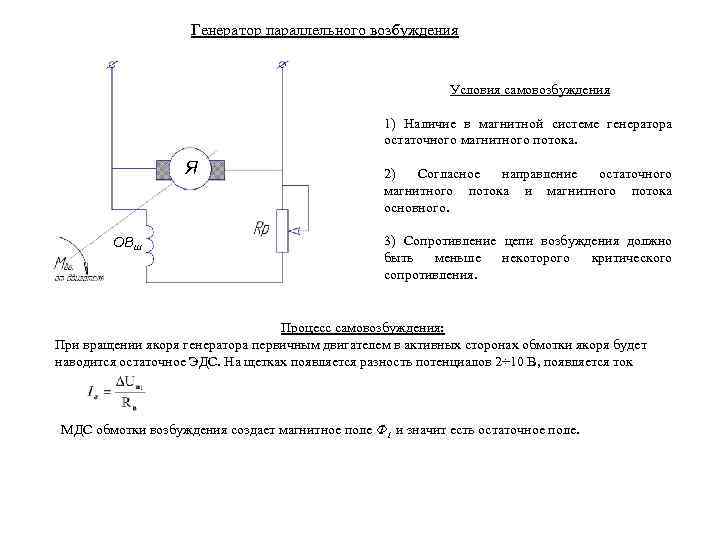 Генератор параллельного возбуждения Условия самовозбуждения 1) Наличие в магнитной системе генератора остаточного магнитного потока. Я ОВш 2) Согласное направление остаточного магнитного потока и магнитного потока основного. 3) Сопротивление цепи возбуждения должно быть меньше некоторого критического сопротивления. Процесс самовозбуждения: При вращении якоря генератора первичным двигателем в активных сторонах обмотки якоря будет наводится остаточное ЭДС. На щетках появляется разность потенциалов 2÷ 10 В, появляется ток МДС обмотки возбуждения создает магнитное поле Ф 1 и значит есть остаточное поле.