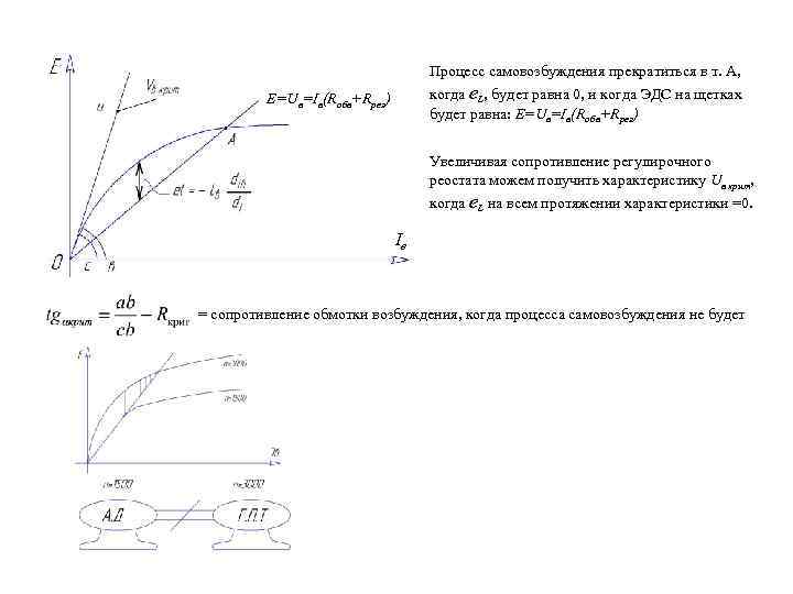 Процесс самовозбуждения прекратиться в т. А, когда е. L, будет равна 0, и когда ЭДС на щетках будет равна: E=Uв=Iв(Rобв+Rрег) Увеличивая сопротивление регулирочного реостата можем получить характеристику Uв крит, когда е. L на всем протяжении характеристики =0. Iв = сопротивление обмотки возбуждения, когда процесса самовозбуждения не будет
