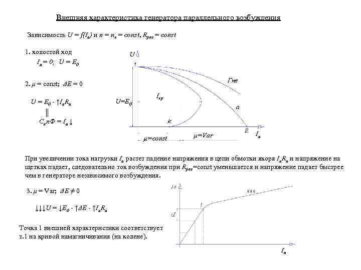 Внешняя характеристика генератора параллельного возбуждения Зависимость U = f(Ia) и n = nн = const, Rрег = const 1. холостой ход Ia = 0; U = E 0 U Гнв 2. μ = const; ΔE = 0 U = E 0 - ↑Ia. Ra U=E 0 Iкр a ║ Cen. Ф = Iв ↓ μ=const μ=Var Ia При увеличении тока нагрузки Ia растет падение напряжения в цепи обмотки якоря Ia. Ra и напряжение на щетках падает, следовательно ток возбуждения при Rрег=const уменьшается и напряжение падает быстрее чем в генераторе независимого возбуждения. 3. μ = Var; ΔE ≠ 0 ↓↓↓U = ↓E 0 - ↑ΔE - ↑Ia. Ra Точка 1 внешней характеристики соответствует т. 1 на кривой намагничивания (на колене). Iв