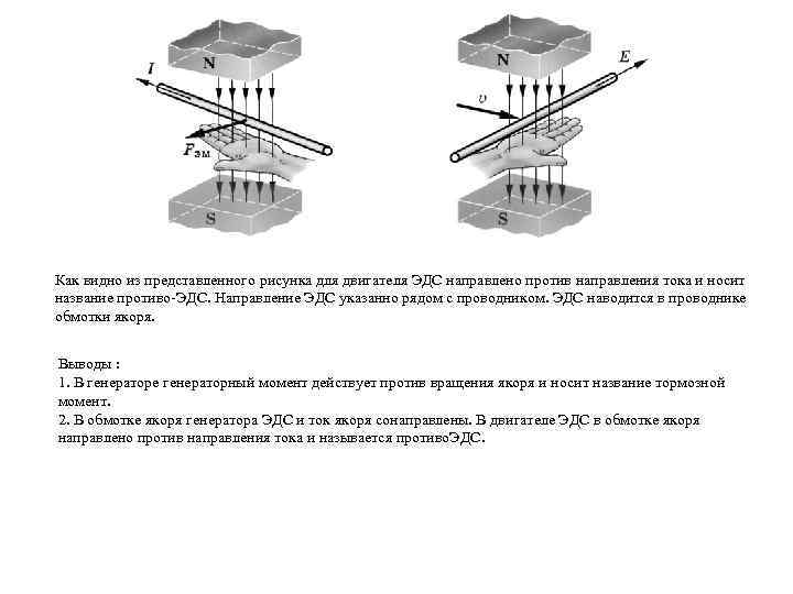 Как видно из представленного рисунка для двигателя ЭДС направлено против направления тока и носит название противо-ЭДС. Направление ЭДС указанно рядом с проводником. ЭДС наводится в проводнике обмотки якоря. Выводы : 1. В генераторе генераторный момент действует против вращения якоря и носит название тормозной момент. 2. В обмотке якоря генератора ЭДС и ток якоря сонаправлены. В двигателе ЭДС в обмотке якоря направлено против направления тока и называется противо. ЭДС.