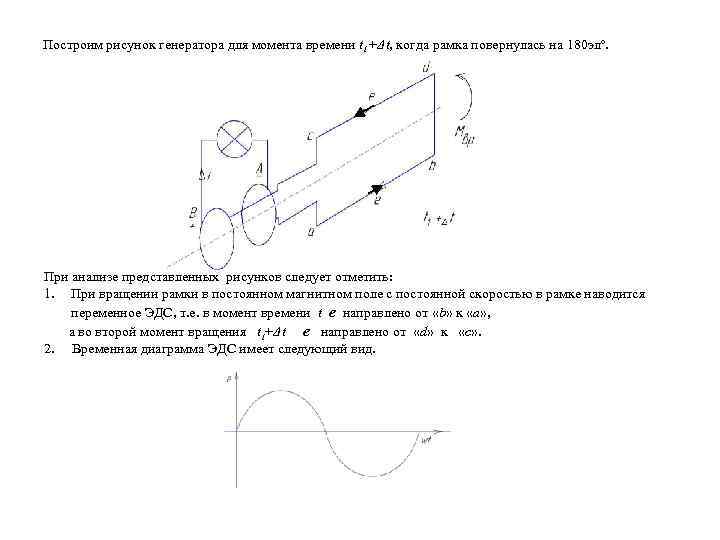 Построим рисунок генератора для момента времени t 1+Δt, когда рамка повернулась на 180 элº. При анализе представленных рисунков следует отметить: 1. При вращении рамки в постоянном магнитном поле с постоянной скоростью в рамке наводится переменное ЭДС, т. е. в момент времени t е направлено от «b» к «а» , а во второй момент вращения t 1+Δt e направлено от «d» к «с» . 2. Временная диаграмма ЭДС имеет следующий вид.