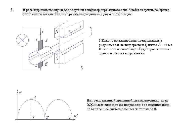 3. В рассматриваемом случае мы получили генератор переменного тока. Чтобы получить генератор постоянного тока необходимо рамку подсоединить к двум полукольцам. 1. Если проанализировать представленные рисунки, то в момент времени t 1 щетка А - «+» , а В - « – » . во внешней цепи будет протекать ток одного и того же направления. На представленной временной диаграмме видно, хотя ЭДС имеет одно и то же направление во внешней цепи, но мгновенное значение меняется от max до 0.