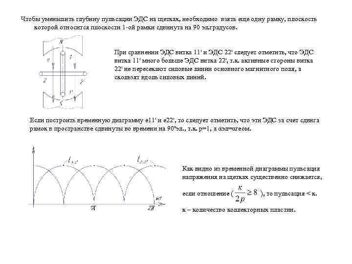Чтобы уменьшить глубину пульсации ЭДС на щетках, необходимо взять еще одну рамку, плоскость которой относится плоскости 1 -ой рамки сдвинута на 90 эл. градусов. При сравнении ЭДС витка 11' и ЭДС 22' следует отметить, что ЭДС витка 11' много больше ЭДС витка 22', т. к. активные стороны витка 22' не пересекают силовые линии основного магнитного поля, а скользят вдоль силовых линий. Если построить временную диаграмму е 11' и е 22', то следует отметить, что эти ЭДС за счет сдвига рамок в пространстве сдвинуты во времени на 90ºэл. , т. к. р=1, а αэл=αгеом. Как видно из временной диаграммы пульсация напряжения на щетках существенно снижается, если отношение ( ), то пульсация < к. к – количество коллекторных пластин.