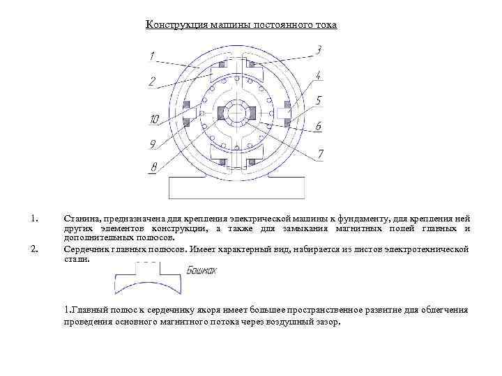 Конструкция машины постоянного тока 1. 2. Станина, предназначена для крепления электрической машины к фундаменту, для крепления ней других элементов конструкции, а также для замыкания магнитных полей главных и дополнительных полюсов. Сердечник главных полюсов. Имеет характерный вид, набирается из листов электротехнической стали. 1. Главный полюс к сердечнику якоря имеет большее пространственное развитие для облегчения проведения основного магнитного потока через воздушный зазор.