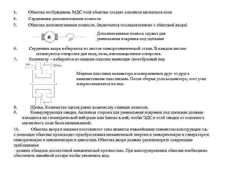 3. 4. 5. Обмотка возбуждения. МДС этой обмотки создает основное магнитное поле Сердечники дополнительных полюсов Обмотка дополнительных полюсов. (включается последовательно с обмоткой якоря) я 6. 7. Дополнительные полюса служат для уменьшения искрения под щетками Сердечник якоря набирается из листов электротехнической стали. В каждом листке штампуются отверстия для вала, пазы, вентиляционные отверстия. Коллектор – набирается из медных пластин имеющих своеобразный вид Медные пластины коллектора изолированных друг от друга миканитовыми пластинами. После сборки узла коллектора, этот узел напрессовывается на вал. 8. 9. Щетки. Количество щеток равно количеству главных полюсов. Коммутирующая секция. Активная сторона для уменьшения искрения под щетками должны находится на геометрической нейтрали или близко к ней, чтобы ЭДС в этой секции от основного магнитного поля была минимальной. 10. Обмотка якоря в машине постоянного тока является важнейшими элементом конструкции т. к. с помощью обмотки происходит преобразование механической энергии в электрическую в генераторе и электрическую в механическую в двигателе. Обмотка якоря должна удовлетворять следующим требованиям: - должна обладать достаточной механической прочностью. При конструировании обмотки необходимо обеспечить линейной потери чтобы увеличить кпд.