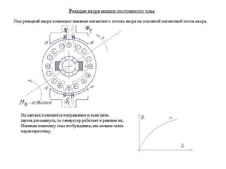 Реакция якоря машин постоянного тока Под реакцией якоря понимают влияние магнитного потока якоря на основной магнитный поток якоря. Ф 0 На щетках появляется напряжение и если цепь щеток разомкнута, то генератор работает в режиме хх. Изменяя величину тока возбуждения, мы можем снять характеристику.