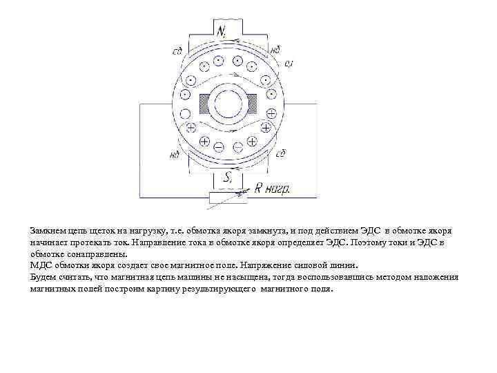 Замкнем цепь щеток на нагрузку, т. е. обмотка якоря замкнута, и под действием ЭДС в обмотке якоря начинает протекать ток. Направление тока в обмотке якоря определяет ЭДС. Поэтому токи и ЭДС в обмотке сонаправлены. МДС обмотки якоря создает свое магнитное поле. Напряжение силовой линии. Будем считать, что магнитная цепь машины не насыщена, тогда воспользовавшись методом наложения магнитных полей построим картину результирующего магнитного поля.