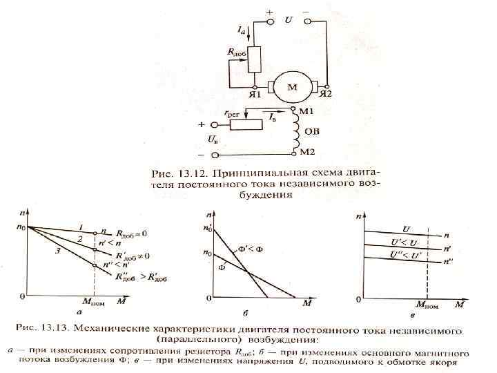 Регулирование частоты двигателей постоянного тока вращения - изменением сопротивления реостата rдоб в цепи якоря; изменением магнитного потока возбуждения Ф (изменением тока в цепи возбуждения Iв ); - изменением напряжения U, подводимого к цепи якоря.