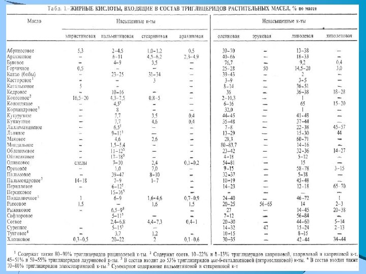 Состав растительных масел u Растительные масла или растительные жиры — извлекают из плодов, семян, корней и других частей растений u Растительные масла в основном (на 95— 97 %) состоят из триглицеридов- эфиров глицерина и жирных кислот, u оставшаяся часть приходится на воски и фосфатиды, а также свободные жирные кислоты, липохромы, токоферолы, витамины и другие вещества, сообщающие маслам окраску, вкус и запах.