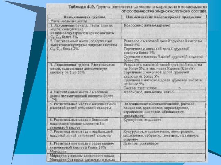 Другие биологически активные соединения растительных масел u В растительных маслах содержатся минеральные вещества - макро- и микроэлементы, которыми богато данное растение. u Воски - жироподобные вещества, состоящие из сложных эфиров высших жирных кислот и высокомолекулярных спиртов; регулируют водный режим растений, выполняют защитные функции. u Жирные масла растений способны сорбировать летучие вещества, в том числе эфирные масла растений. u Некоторые растительные масла содержат дубильные вещества, алкалоиды, гликозиды, слизи. Наличие этих веществ обусловливает вкус, аромат и лечебные свойства масла.