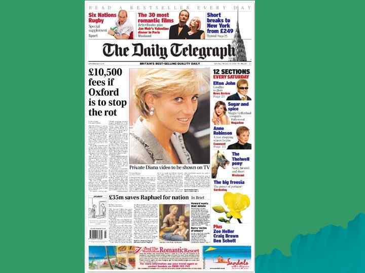 Quality Broadsheets—and Quality Compacts u The Times, UK’s oldest national newspaper, not the most popular u The Daily Telegraph (the Daily Torygraph) u The Independent, The Guardian, The Financial Times