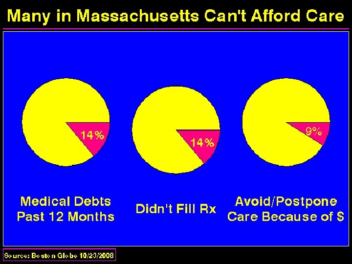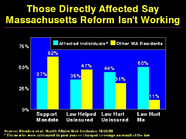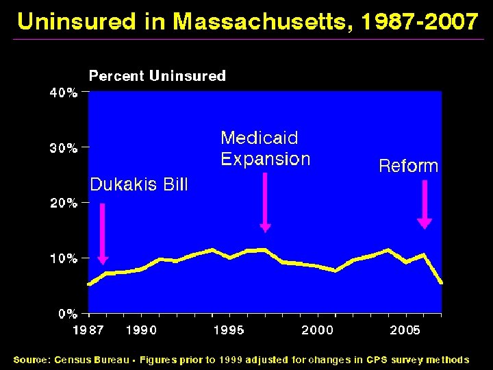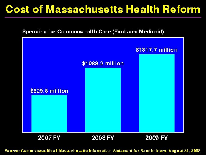 Massachusetts 2006 “Every uninsured citizen in Massachusetts will soon have affordable health insurance and the costs of health care will be reduced. Gov. Romney. ” “The bill does what health experts say no other state has been able to do: provide a mechanism for all of its citizens to obtain health insurance. ” Sources: Wall Street Journal 4/11/06 and New York Times 4/5/06.