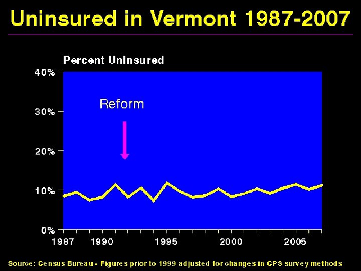 Vermont 1992 “This is an incredibly exciting moment that should make all Vermonters proud. ” Gov. Dean “Governor Howard Dean, the only governor who is a doctor, signed a law here today that sets in motion a plan to give Vermont universal healthcare by 1995. ” Source: New York Times 4/12/92
