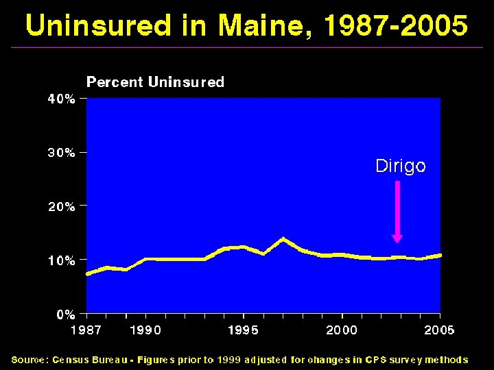 Maine 2003 “It’s bold and comprehensive, and it’s now the law of the state. ” Gov. Baldacci “Maine has just become the first state in the union to approve a plan to provide universal access to affordable health insurance. ” Sources: AP Newswire 4/25/06 and Ellen Goodman, Washington Post Writers Group 7/7/03.