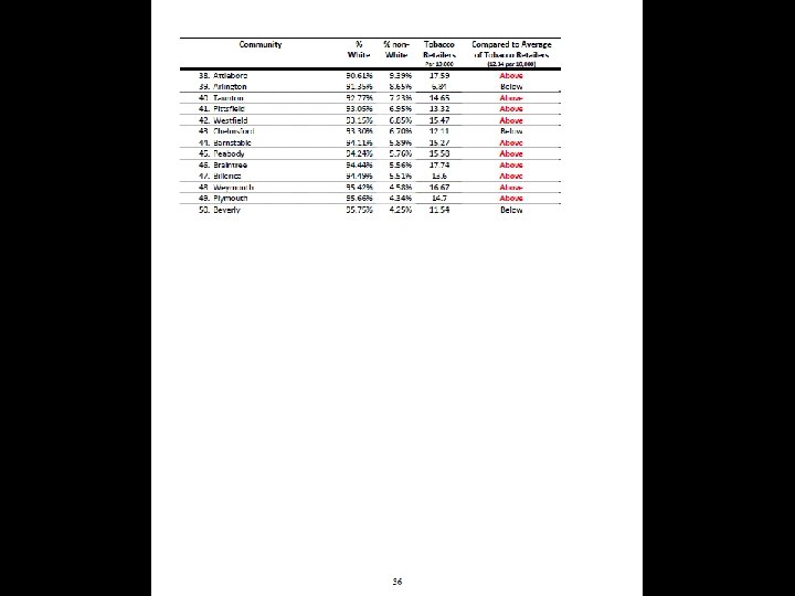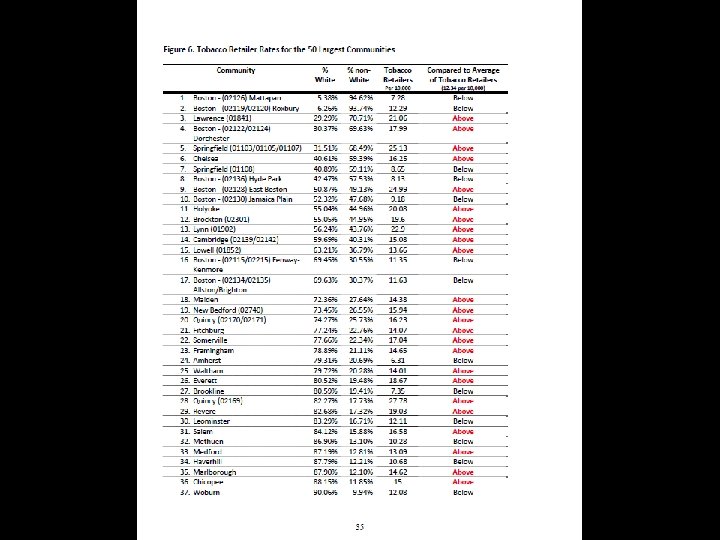 Health Disparities Report Card Report from Massachusetts Department of Public Health • Tobacco Retailers: – Exposure to tobacco advertising is not equally distributed in communities and neighborhoods across the state – As of December 31, 2010, the Massachusetts Tobacco Cessation and Prevention Program estimated that there were 8, 838 tobacco retailers (1 retailer for every 718 residents) – Communities with a greater proportion of non-Hispanic Whites tend to have more tobacco retailers per capita – The 25 largest communities all of which have at least 20% non-White population-17 have higher rates of tobacco retailers than the statewide average