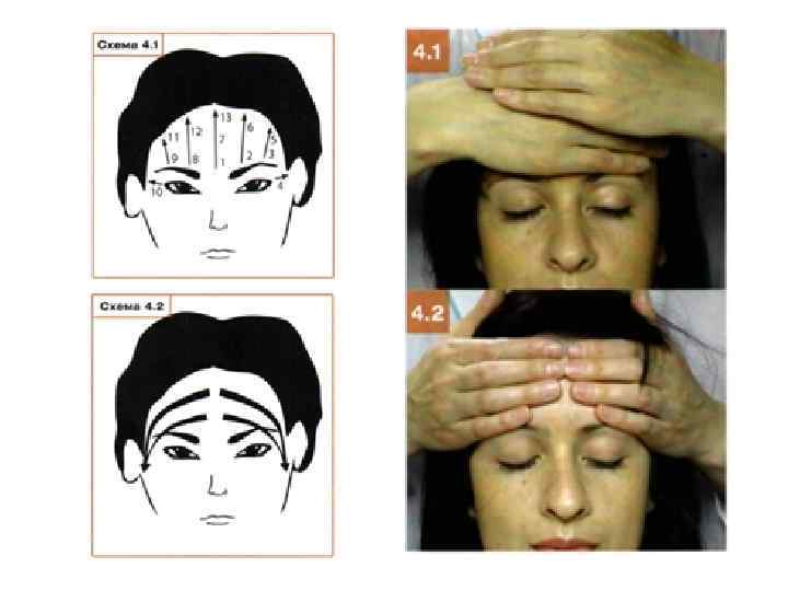 Этап 4. Вертикальное поглаживание лобной и височной мышц • Ладонной поверхностью ІІ-V пальцев дважды выполните вертикальное поглаживание лобной и височной мышц попеременно одной и другой рукой в направлении от бровей к линии роста волос (схема 4. 1). Каждый участок поглаживают два раза. Движение начинайте от середины лба (фото 4. 1) сначала в правую, а затем в левую сторону. Дойдя до середины лба (схема 4. 2, фото 4. 2), разведите руки к височным ямкам и выполните легкий нажим. Каждое поглаживание делайте на один счет; движения повторите три раза.