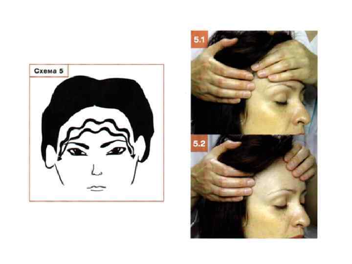 Этап 5. Волнообразное продольное поглаживание мышц лба • Ладонной поверхностью полусогнутых по форме лба ІІ-V пальцев попеременно правой и левой рукой выполните волнообразное поглаживание лба. При этом другую руку зафиксируйте на противоположном виске (фото 5. 1, 5. 2, схема 5).