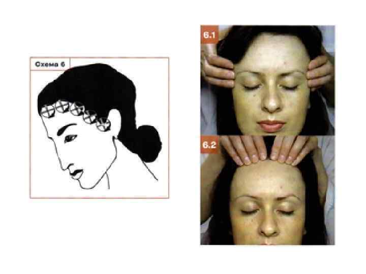 Этап 6. Растирание височных и лобных мышц • Подушечками слегка согнутых ІІ-ІV пальцев обеих рук выполните растирание височных мышц и верхних краев лобной мышцы в трех направлениях: продольном, поперечном и круговом, двигаясь от височной ямки (фото 6. 1) к центру лба по линии роста волос (фото 6. 2). Прием проводится один раз, на счет 4 (схема 6).