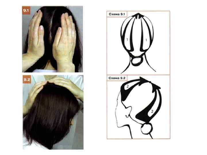Этап 9. Круговое разминание затылочной и лобной мышц • Ладонной поверхностью обеих рук одновременно выполните круговое разминание затылочной мышцы в направлении от линии роста волос к теменной области (фото 9. 1). Разминание проведите по часовой стрелке и обратно, затем сместите пальцы на 2 -3 см выше и повторите движение. • Выполните тот же прием, двигаясь в направлении ото лба и затылка к центру теменной области (фото 9. 2). Повторите движение три раза, на счет З (схемы 9. 1, 9. 2).