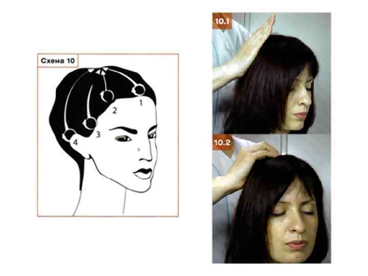 Этап 10. Поверхностное круговое разминание кожи головы • Последовательно запястьем (фото 10. 1), пястьем и концевыми фалангами ІІ-IVпальцев (фото 10. 2) выполните круговое разми-нание кожи головы правой рукой на правой половине головы, при этом левой рукой фиксируйте голову пациента; затем поменяйте руки. Движение начинайте от линии роста волос в центре лба (схема 10), далее двигайтесь по сагиттальному пробору в направлении затылка, затем по радиальным проборам снизу вверх, сначала по правой, а потом по левой половине головы. Прием проведите один раз, на счет 3 в каждой точке (схема 10).