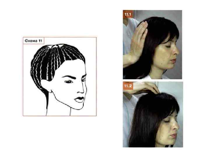 Этап 11. Легкая вибрация кожи головы • Попеременно правой и левой рукой последовательно запястьем (фото 11. 1), пястьем и концевыми фалангами II - IV пальцев (фото 11. 2) выполните легкую вибрацию кожи головы поверх волосяного покрова. Движение осуществляйте в той же последовательности, что и на предыдущем этапе. Прием проведите один раз, на счет З в каждой точке (схема 11).
