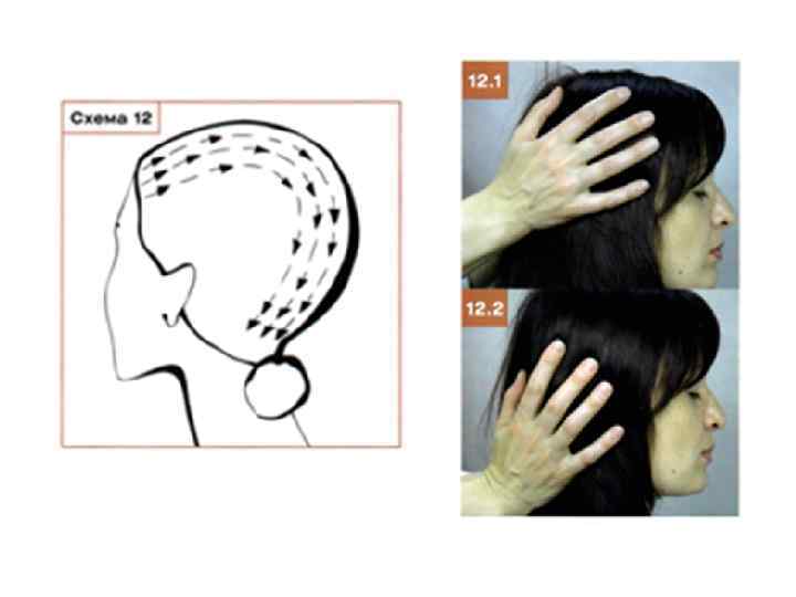Этап 12. Поглаживание кожи волосистой части головы • Широко расставленными концевыми фалангами ІІ-ІV пальцев правой руки выполните поглаживание кожи головы в направлении ото лба (фото 12. 1) к затылку (фото 12. 2). Сначала проведите прием правой рукой (схема 12), при этом левой фиксируйте голову, а затем наоборот. Завершите массаж головы легким поглаживанием волос в том же порядке и направлении.