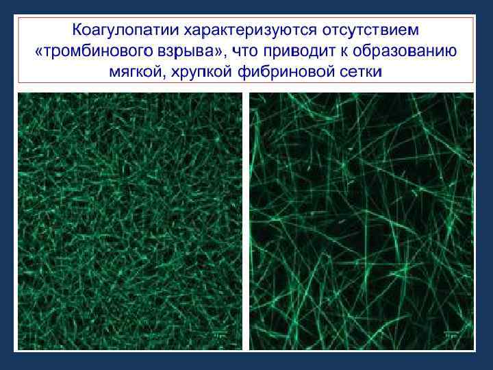 Нарушение формирования фибринового сгустка • В нормальных условиях достигается высокая пиковая концентрация тромбина ( «тромбиновый взрыв» - 200 -500 н. М) образуется плотный, густосетчатый фибриновый сгусток. • При дефиците в первую очередь FIX снижается концентрация теназы внутреннего пути (комплекс VIIIа-IXа), которая активирует фактор Х со скоростью до 100 раз большей, чем теназа внешнего пути (комплекс ТФ-VIIа). • образуется редкосетчатый с тонкими нитями фибрина, рыхлый сгусток.