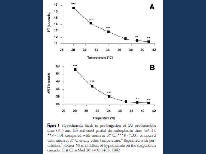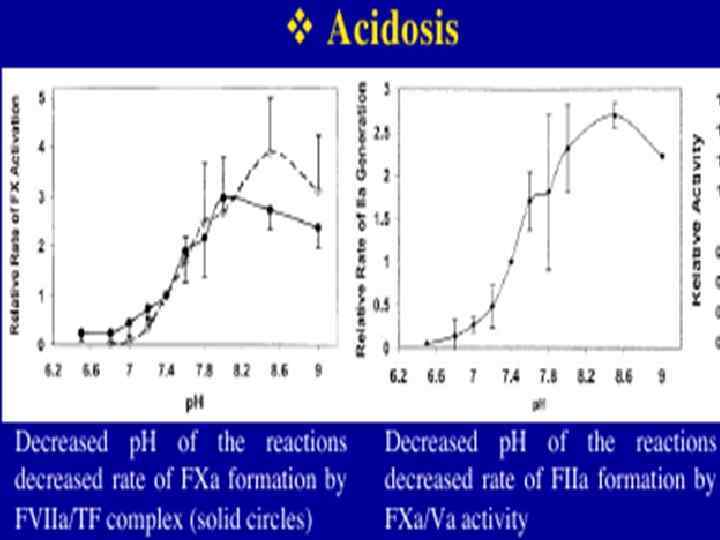 Гипотермия и Ацидоз • Гипотермия оказывает влияние на фазу инициации свертывания крови, поэтому генерации тромбина происходит с задержкой по времени. • Ацидоз имеет влияние на фазу распространения, что значительно нарушает генерацию тромбина и в целом гемостатическую функцию крови. • Ацидоз существенно повышает интенсивность фибринолиза