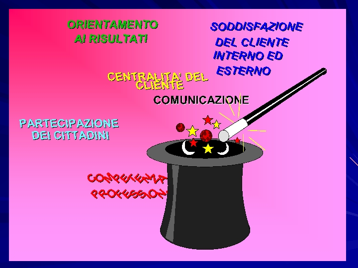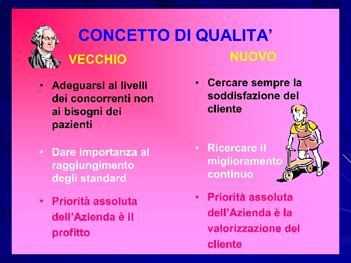 Perchè la ricerca della qualità in sanità v Non solo per la pressione normativa ma soprattutto per la pressione dei pazienti-consumatori sempre più informati dei propri diritti e con maggiori aspettative; v Centralità del cliente nelle strategie produttive tendenti alla fidelizzazione del cliente; v Da una sanità di massa (tutto a tutti) ad una Sanità appropriata, efficace ed efficiente in rapporto alle esigenze degli utenti clienti.