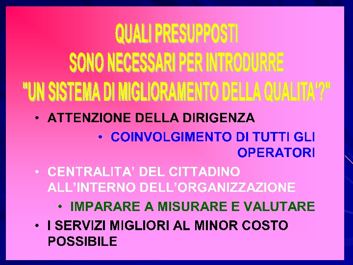 Continuous Quality Improvement – (CQI) (anni ’ 90) “Miglioramento Continuo della Qualità” STRUMENTI del CQI FINALITA’ del CQI § Lavoro per Progetti § Progettare Corsi di Formazione e § Lavoro per Gruppi Metodi per la realizzazione di Sistemi Qualità nelle aziende § Cultura della valutazione e della misurazione § Approccio circolare di Analisi, Progettazione, Realizzazione, Valutazione § Tecniche del “problem solving” § Analisi e Governo dei Processi Aziendali § Formare persone (responsabili aziendali per la Qualità, referenti per la Carta dei Servizi, altri dirigenti), per metterle in grado di sostenere lo sviluppo § Monitorare e diffondere i risultati secondo metodi di comparazione che stimolino i professionisti al miglioramento continuo
