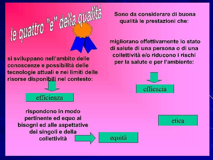 Il Concetto di Qualità nei Servizi Sanitari e Sociali Si può definire una prestazione sanitaria o sociale come di buona qualità: v Se migliora lo stato di salute di una persona o di una collettività e/o riduce i rischi per la salute o per l’ambiente; v Se risponde in modo pertinente ed equo ai bisogni ed alle aspettative dei singoli o della collettività; v Se si sviluppa nell’ambito delle conoscenze (EBM) e delle tecnologie disponibili nel contesto.